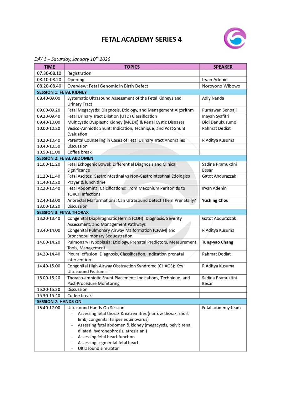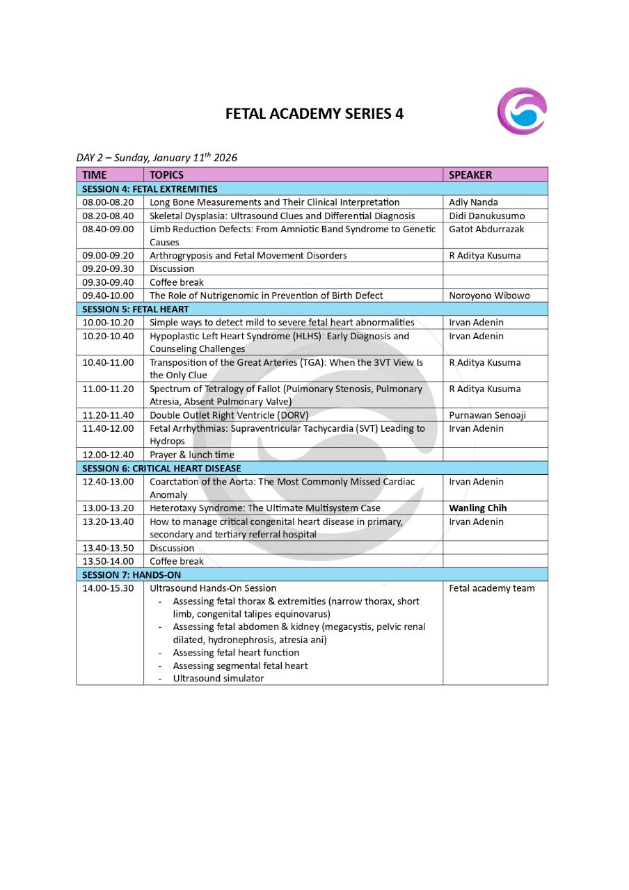 Ayo submit abstrak Anda untuk berkontribusi dalam diskusi anomali janin trimester awal! Pelatihan ini cocok untuk dokter spesialis obstetri ginekologi dan profesional fetomaternal yang ingin mendalami deteksi anomali dengan pendekatan hands-on. Kursi terbatas – daftar sekarang!